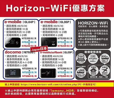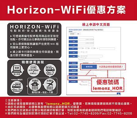 即日起,如果有朋友想要訂購 HORIZON公司的無線分享路由器服務 或是HORIZON Wi-Pad租用服務,可以在申請訂購時,輸入 lemonz 的優惠代號:lemonz_HOR,就可以優惠價訂購無線分享路由器服務,訂購價格可參考以下圖片。而當朋友們獲得優惠的同時,lemonz 也會獲得小小介紹費。